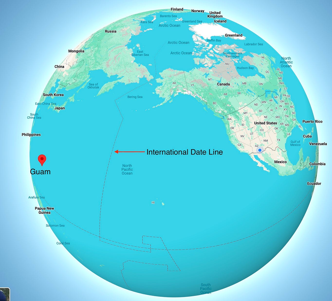 I was struck by the juxtaposition of the statements by the DC super-sleuth and the CO/NJ super-champ: “Guam contains the westernmost point in the United States” and “Guam is the first place in the world where the sun rises on US soil.” But the sun rises in the east! At first I thought they couldn’t both be right, but a look at the globe makes it clear: