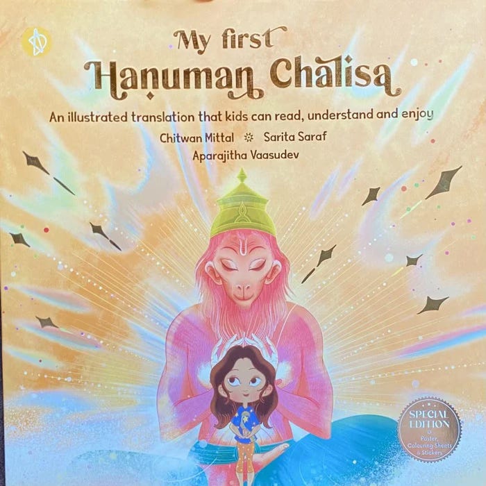 A useful way to think about Hindu scriptures is with the analogy of an expansive, thick rainforest. Just like a rainforest’s mind-boggling diversity of flora and fauna, the world of Hindu texts contains a variety of gods and goddesses that can be difficult to fully comprehend. Yet, like a giant ancient tree towering over the canopy, one god shines through: Hanuman. Though he is introduced halfway through the epic Ramayana, his importance is so immense that he appears on the flag of Arjuna’s chariot in the Mahabharata’s climactic battle, with none other than Krishna as the charioteer. Hanuman holds a special place in the hearts of Hindus, both young and old. Children are encouraged to emulate his devotion. When they hesitate before a great challenge, they are reminded of Hanuman’s initial apprehension before his monumental leap to Lanka—after which he soars into the sky and single-handedly shakes the foundations of the island kingdom. Hanuman’s various facets are gloriously encapsulated in Goswami Tulsidas’s famous 16th-century poem, the ‘Hanuman Chalisa.’ Its 40 verses, written in the Awadhi dialect, are known across the vast Hindu world. Millions who are unfamiliar with the language memorize the entire poem, which takes about ten minutes to recite. Despite the Chalisa’s ubiquity, I had yet to find a book that truly did it justice—until I discovered “My first Hanuman Chalisa, an illustrated translation that kids can read, understand and enjoy” by Chitwan Mittal, Sarita Saraf and Aparajitha Vaasudev. Each couplet is covered over two pages, with the original text shown in both Devanagari and Roman scripts. While a formal transliteration system like IAST would have been a bonus, the included Roman script is still immensely helpful for those not fluent in Devanagari. Even more impressive is how the book gives centre stage to the plain English meaning of each verse, clearly connecting the translation to the original Awadhi words. Elegant illustrations and appealing stylistic choices elevate the content, making it engaging even for a curious adult. As a Hindu parent, I see this book as a treasure. In a market where many books on Hindu topics for children can be bland or inaccessible with mediocre production value, this work stands out. While movies and videos compensate for what the book world often lacks, spending time with a well-made book leaves a more lasting and personal imprint on the reader. Buy this book for every kid you know, and for any curious grown-ups too. Gift it for all occasions, from birthdays to house-warmings. Finally, as we support these creators, let’s also be inspired to bring more such splendid books to life. -Book reviewed by P. Shashanka, a Canada-based Hindu father taking his kids along on a journey to deepen roots and instill in daily life the timeless values of the Hindu tradition. Subscribe to the Hindu Parenting newsletter to get the latest articles and podcasts. Leave a note, DM or send email to contact@hinduparenting.org if you’d like to share your viewpoints, experiences and wisdom as Hindu parents, or if you wish to join our community! You can also follow us on X (Twitter) or Instagram. Our handle is “hinduparenting” You're currently a free subscriber to Hindu Parenting. For the full experience, upgrade your subscription. |