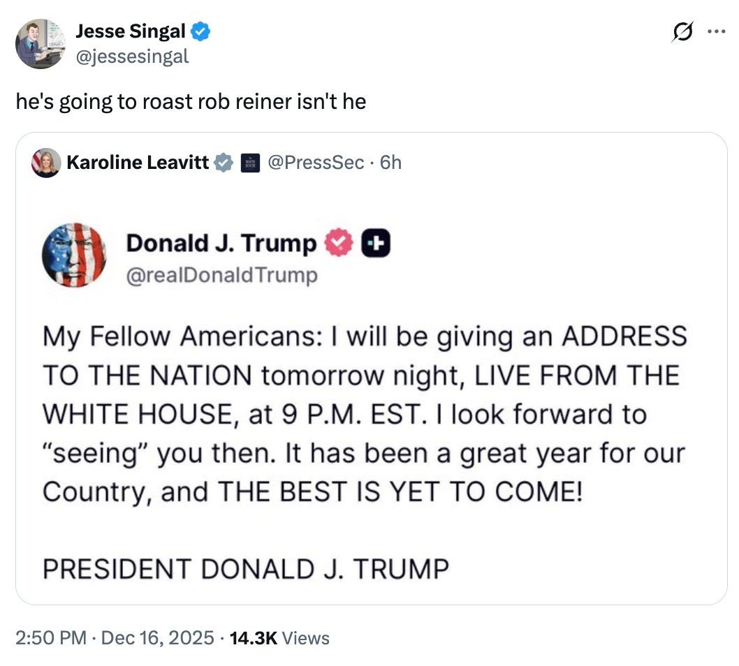 Quick HitsSUSIE SURVIVES: Susie Wiles, Donald Trump’s chief of staff, seems to be doing pioneering new research in the field of political anti-gravity. It was revealed yesterday that she had committed one of Trumpworld’s most unforgivable sins: She gave an enormous trove of shockingly candid quotes undercutting many of the administration’s own talking points to the hated liberal media. (We compiled some of her choicest statements in yesterday’s Morning Shots.) Yet Trump and his allies circled wagons around Wiles yesterday, with everyone from Trump to Don Jr. to JD Vance heaping praise on her and even suggesting her unflattering comments might have had a grain of truth. Trump told the New York Post he wasn’t offended by Wiles’s comment that he has an “alcoholic’s personality”: “I’ve said that many times about myself . . . possessive and addictive type personality.” Vance, meanwhile, seemed unoffended that Wiles apparently regards him as a “conspiracy theorist for a decade”: “Sometimes I am a conspiracy theorist,” he said, “but I only believe in the conspiracy theories that are true.” It’s a remarkable vote of confidence in Wiles, who one can only assume must truly be as indispensable to the functioning of the White House as reporting has always suggested. That, or Wiles is a rare person Trump and Co. are unwilling to make an enemy of—and who could blame them for feeling that way about a woman who went and got Trump re-elected president in large part to spite Ron DeSantis? PETE SAYS NO: The Pentagon is making video of its controversial September “double-tap” Caribbean strike available to more lawmakers—while slamming the door on releasing the footage more broadly. “In keeping with longstanding Department of War policy, Department of Defense policy, of course we’re not going to release a top-secret full unedited video of that to the general public,” Hegseth told reporters yesterday. This was a dodge: It would not take a release of the “full, unedited video” of the second strike and the hours leading up to it to establish whether the White House is telling the truth about the shipwrecked mariners they re-targeted, supposedly on the belief they were trying to “get back in the fight.” And it’s not clear Hegseth was too worried about “longstanding Department of War policy” on such matters when he released the video of the first strike as sizzle-reel footage on social media. But it seems the administration has now fully moved on from Donald Trump’s early pledge to release the footage. ‘POTENTIALLY DIVISIVE’ MAKES A COMEBACK: When the Washington Post reported last month that the U.S. Coast Guard was changing its workplace harassment policy to label symbols like swastikas and nooses “potentially divisive”—a significant softening of language from its earlier policy, which called them “hate symbols”—the administration immediately rushed to deny the news. “This is an absolute ludicrous lie and unequivocally false,” DHS spokesperson Tricia McLaughlin said, calling the story “fake crap.” The same day, acting Commandant of the Coast Guard Adm. Kevin Lunday sent a memo to the entire service that seemed intended to clean up the story: “Divisive or hate symbols and flags are prohibited,” Lunday wrote, including swastikas and nooses. Now, however, the Coast Guard has gone ahead and put the controversial policy into effect. Again, it was the Washington Post that reported on the document, which has been posted online and includes not Lunday’s strong language, but the same mealy-mouthed text the Post reported on originally. “Potentially divisive symbols and flags include, but are not limited to, the following: a noose, a swastika, and any symbols or flags co-opted or adopted by hate-based groups as representations of supremacy, racial or religious intolerance, or other bias.” Cheap ShotsYou’re a free subscriber to The Bulwark—the largest pro-democracy news and analysis bundle on Substack. For unfettered access to all our newsletters and to access ad-free and member-only shows, become a paying subscriber.We’re going to send you a lot of content—newsletters and alerts for shows so you can read and watch on your schedule. Don’t care for so much email? You can update your personal email preferences as often as you like. To update the list of newsletter or alerts you received from The Bulwark, click here. Having trouble with something related to your account? Check out our constantly-updated FAQ, which likely has an answer for you. |